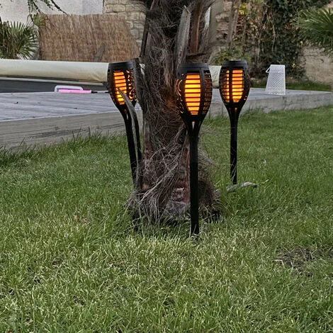 - Lot de 4 mini-piquets LED solaires effet Flamme, finition plastique noir